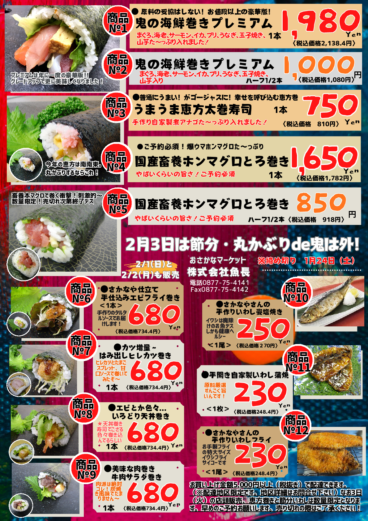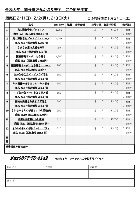 本年度の節分は2月3日、火曜日となります。販売日は2月1日(日)、2日(月)、3日(水)の3日間となります。琴平店での販売は1日、2日はご予約のみ、3日はご予約と店頭販売を予定いたしております。綾川町JA讃さん広場滝の宮は1日、2日のみの販売となります。ご予約分と店舗お寿司コーナーでの販売を予定しております。三豊市財田町 道の駅たからだの里産直内鮮魚コーナ―は3日(火)にご予約分と一般小売を予定しています。